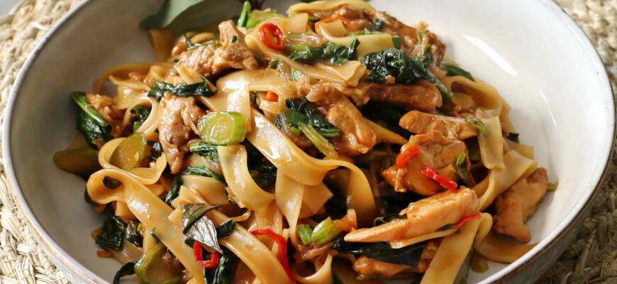 Pad kee mao, which means "drunken noodles" in Thai, is a spicy, sweet, and savory stir-fry featuring rice noodles, chicken, and Chinese broccoli. ”It is one of the easiest, and most delicious noodle recipe I know,” says Chef John.