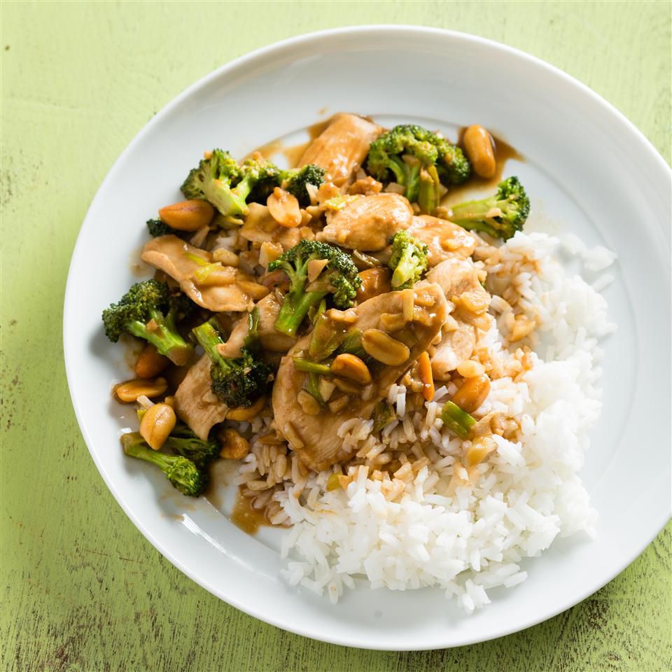 "This is a very tasty Asian-inspired dish made with chicken and broccoli in a spicy peanut sauce," says NIMITZ. "If you like it mild, use less cayenne, like it spicy, use more. If you're salt conscious, use low sodium soy sauce."